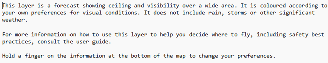 “This layer is a forecast showing ceiling and visibility over a wide area. It is coloured according to your own preferences for visual conditions. It does not include rain, storms or other significant weather.
